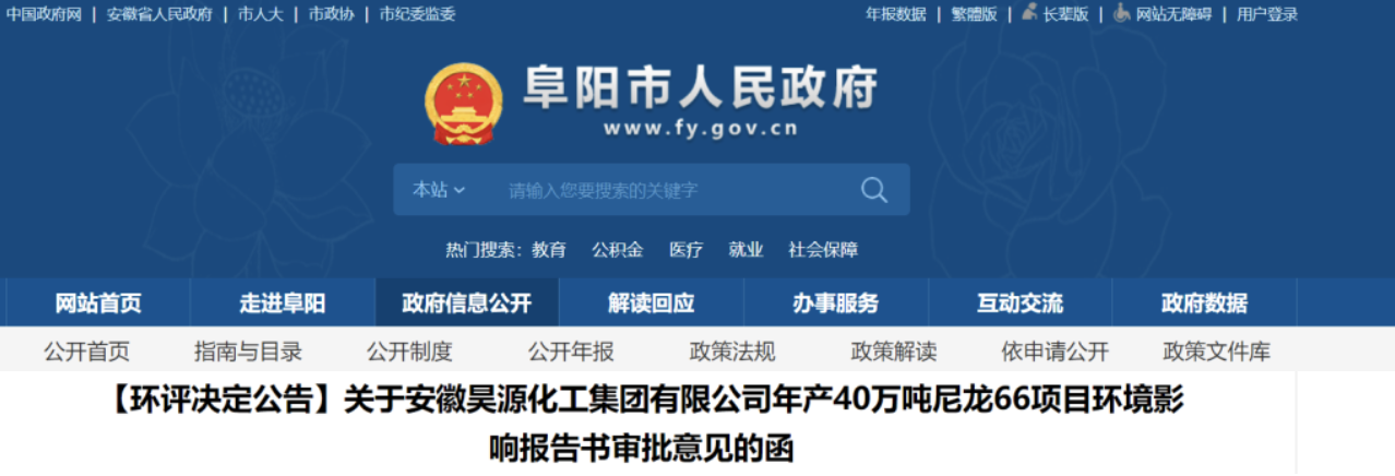 Recently, the official website of the Fuyang Municipal People’s Government released information about Anhui Haoyuan Chemical Group Co., Ltd. A letter of approval opinion on the environmental impact report of the project with an annual output of 400,000 tons of nylon 66.