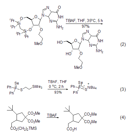 Desilylation reaction TBAF is widely used in desilylation reactions. This type of reaction can usually be carried out under relatively mild conditions and has a high yield. It is the key to cutting off Si-O (Formula 2)[3] and Si-N are also applicable to heteroatoms (formula 3) [4] and carboxyl groups (formula 4) [5] Desilylation reaction.