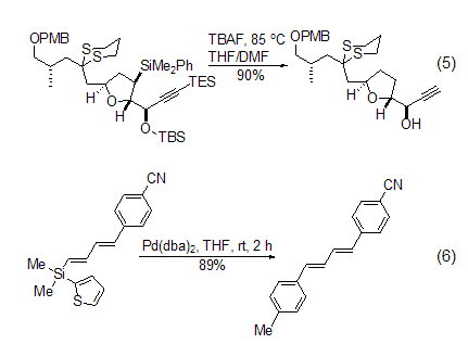 TBAF is still a very strong Dealkylosilation reagent, widely used to cut Si-C bonds, especially sp2-C-Si and sp3-C adjacent to double or triple bonds. -Si bond (Formula 5)[6]. If TBAF is used in combination with a transition metal catalyst, the desilylation reaction and the coupling reaction can be carried out simultaneously (Formula 6)[7].