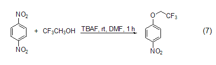 Catalytic nucleophilic substitution Reaction TBAF can catalyze nucleophilic substitution reactions on dinitrobenzene, such as the reaction between p-dinitrophenyl and trifluoroethanol (Formula 7)[8]. The catalytic mechanism is to first replace a nitro group with fluorine, and then the hydroxyl group of trifluoroethanol nucleophilically attacks the carbon atom connected to the fluorine to obtain the target product.