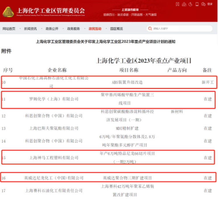 In addition, the Shanghai Chemical Industry Park Management Committee recently announced the 2023 key industry project plan of the Shanghai Chemical Industry Park. Involving 26 projects with an investment of 25.57 billion yuan, including Rohm Chemical PMMA third-line project, Shanghai Shenma Engineering Plastics 60,000 tons special nylon 66 chip project (first phase 20,000 tons), INVISTA Polymer Phase III expansion project, These projects are all projects under construction.