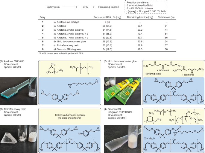 Specifically, the researchers showed that by using a ruthenium-based catalyst and the solvents isopropanol and toluene, they could separate the epoxy matrix and release one of the original building blocks of epoxy polymers, bisphenol A, and intact glass fibers in a single the process of.