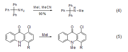 N -Methylation Methylation of ammonia and primary amines with methyl iodide is generally not a good method because further methylation will occur, but for secondary and tertiary amines Methylation is a better method and can be used to prepare tertiary amines and quaternary ammonium salts[7]. In acetonitrile solvent, tritylamine is methylated with methyl iodide to obtain the product with higher yield (Formula 4)[8]. The nitrogen atoms in the heterocyclic ring can also be methylated with methyl iodide (Formula 5)[9,10].