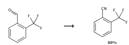 Combine 2-trifluoromethylbenzaldehyde (2.0mmol, 1.0 equivalent), H2NOH·HCl (153mg, 2.2mmol), Na2CO3 (117 mg, 1.1 mmol) and DMSO (10 mL, 0.2 M) were added to an oven-dried reaction tube (30 mL) equipped with a stir bar. The reaction mixture was allowed to react at room temperature for 30-60 minutes and the reaction was monitored by TLC. After the aldehyde is completely consumed, add another portion of Na2CO3 (1.06g, 10mmol) to the mixture and cover the reaction tube with a plastic stopper. The SO2F2 gas was passed through the SO2F2 balloon and stirred with slow bubbling at room temperature for 12 hours. The reaction mixture was diluted with water, and the mixture was extracted with dichloromethane (3 × 20 mL). The combined organic layers were washed with brine and anhydrous Na2< Dry the mixture over SO4 and concentrate the mixture to dryness. The residue was purified by silica gel chromatography using a mixture of petroleum ether/ethyl acetate = 10:1 (v/v) as the eluent to obtain 2-trifluoromethylbenzonitrile.