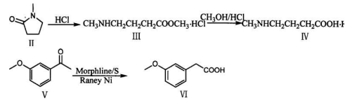Add 33g sublimated sulfur, 96.5ml 3-methoxyacetophenone (V) and 92ml morpholine into a 1000ml three-necked flask, and reflux for 15 hours under mechanical stirring. Cool the temperature to about 30°C, add a mixed solution composed of 350ml glacial acetic acid, 105ml distilled water and 70ml concentrated sulfuric acid under mechanical stirring, and continue to reflux for 5.5 hours. Pour the reaction mixture into ice water (400g ice + 100ml water), stir mechanically until a yellow-brown solid precipitates (add crushed ice if necessary), quickly cool and filter in an ice bath. Dissolve the solid with 300 ml of 20% sodium hydroxide aqueous solution and filter. Add the brown insoluble matter to 100 ml of 20% sodium hydroxide aqueous solution, heat and reflux for half an hour, and filter while it is hot.