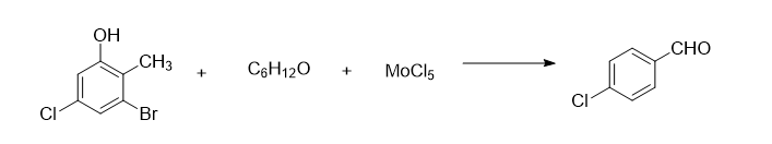 Add 2.5 mol of 2-methyl-3-bromo-5-chlorophenol and 3 mol of 80% 4-methyl-2-pentanone solution into the reaction vessel, control the stirring speed to 170 rpm, and increase Bring the temperature of the solution to 40°C, add 3.2 mol of molybdenum pentachloride powder three times, continue the reaction for 40 minutes after the addition, distill under reduced pressure at 1.32kPa, collect the fraction at 82°C, and add it to an 80% butyl glycolate solution. Wash 3 times in medium, wash 5 times in an 85% ethanedinitrile solution, and recrystallize in a 90% 2-methylbutyric acid solution to obtain 311.5g of crystalline 4-chlorobenzaldehyde, yield 89%.