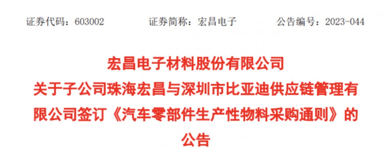 On September 19, Hongchang Electronics announced that its subsidiary Zhuhai Hongchang and Shenzhen BYD Supply Chain Management Co., Ltd. signed the “General Rules for the Procurement of Production Materials for Auto Parts”.