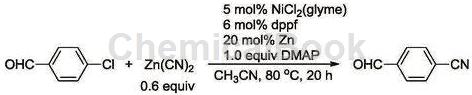 Method 1: Under argon protection, add NiCl2(glyme) (0.05mmol, 11.0mg), dppf (0.06mmol, 33.3mg), Zn (0.2mmol, 13.0mg) in sequence to a 25.0mL sealed tube. DMAP (1.0mmol, 122.2mg), Zn(CN)2 (0.6mmol, 70.5mg), p-chlorobenzaldehyde (1.0mmol, 140.6mg) and acetonitrile (5.0mL), and then placed directly into an 80°C oil bath During the reaction, stop heating after 20 hours, cool to room temperature, filter the reaction solution directly through a short silica gel column, rinse with dichloromethane, concentrate, and directly purify by silica gel column chromatography (in view of the fact that most of the product is easily pumped away, in order to avoid stirring Sample loss, unless otherwise specified, all samples are loaded by wet method.) Eluent: petroleum ether/ethyl acetate = 10:1, the product is 114.3 mg of white solid 2-cyanobenzaldehyde, yield 87%, 1HNMR Purity is greater than 98%.