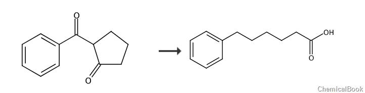 5.65 g of 2-benzoylcyclopentanone (30 mmol, 1.0 equiv) was suspended in a solution consisting of 5.04 g of potassium hydroxide (90 mmol, 3.0 equiv) and 260 ml of water. Heat the reaction system to a reflux state and maintain reflux until the reaction system becomes a homogeneous phase. Cool to room temperature, and adjust the pH value of the system to 4 with hydrochloric acid to precipitate compound 6-oxo-6-phenylhexanoic acid (4.94 g, crude yield: 80%). Recrystallization from isopropanol afforded pure 6-oxo-6-phenylhexanoic acid (3.71 g, yield: 60%). 1H NMR (300MHz, CDCl3) δ7.57-7.37 (m, 5H), 2.92 (t, J=7.5Hz, 2H), 2.33 (t, J=7.5Hz, 2H), 1.74-1.56 (m, 2H), 1.40-1.32 (m, 2H).