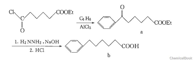 Add 100ml of diethylene glycol (1.05mol), 23.4g (0.1mol) of ethyl 5-benzoylvalerate, and 30ml of 80% hydrazine hydrate into a 500ml four-neck bottle equipped with a condensation reflux tube. After mixing, heating and refluxing for 2 hours, lower the temperature and install a water separation device. Steam out and collect the water and unreacted hydrazine hydrate below 180°C. Stop heating. After the reactants have cooled, add 8g (0.2mol) of 80% hydrogen into the system. Sodium oxide aqueous solution, heat the reaction below 210°C, and collect the water generated by the reaction. When the reaction rises to 210°C, remove the water separation device, reflux for 3 hours and then cool to room temperature. Use cold dilute hydrochloric acid to acidify the mixture until no new water is generated. Until precipitation, the product phenyhexanoic acid is obtained by suction filtration.