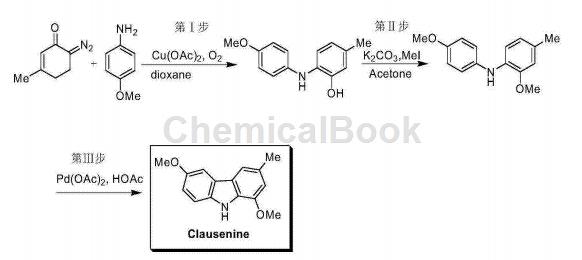 1. Clausenine is a carbazole natural product with antibacterial activity. CN201410027161 reports a copper-catalyzed reaction of 6-diazo-3-methyl-2-cyclohexen-1-one and p-methoxyaniline to generate 2-(4-methoxyphenylamino)-5- Toluene; then through methylation and palladium-catalyzed C-C bond coupling, the natural product Clausenine can be obtained. The reaction route is as follows: