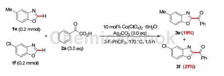 The specific steps are as follows: Add 6-chlorobenzoxazole (0.2mmol), α-oxocarboxylic acid 2 (0.6mmol), Co(ClO4)2·6H2O (7.3mg) to a 35mL oven-dried pressure tube. , 0.02mmol), Ag2CO3 (165.4mg, 0.6mmol). ) and 3-F-PhCF3 (2.0mL). The tube was then sealed and stirred vigorously at 170°C for 24 hours. After cooling to room temperature, the reaction mixture was diluted with DCM (20 mL), filtered through a pad of Celite, and the filtrate was concentrated in vacuo. The residue was purified by silica gel flash chromatography (1% ethyl acetate in petroleum ether, v/v) to afford the desired products (3e) and (3f).