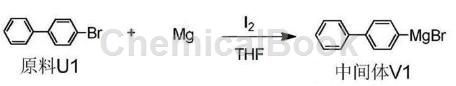 Method 2: In a 250mL three-necked flask, in a nitrogen atmosphere, add 0.05mol raw material U1 and 0.06mol Mg powder, dissolve them in 60ml dry tetrahydrofuran, add 0.0004mol elemental I2, heat to 40°C and stir until the solution turns from yellow It turns colorless. Heat the above mixed solution to 80°C and stir for 4 hours. No magnesium powder remains. The reaction is complete and the Grignard reagent 4-diphenylmagnesium bromide is generated. No purification is required, and the next step is carried out directly.