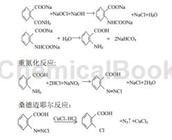 The diazotization method uses phthalic anhydride as raw material. First, it undergoes amidation reaction with NaOH and NH4OH to generate sodium o-carboxamido benzoate. After NaOCl degradation reaction, sodium anthranilate is generated, which is neutralized and refined to obtain o-aminobenzoate. Benzoic acid is then subjected to a diazotization reaction with Na2SO3 and HCl. Under the catalysis of cuprous salt, the diazo group of the obtained diazonium salt is replaced with a chlorine group and a Sandmeyer transformation reaction occurs to obtain a crude o-chlorobenzoic acid product. After refining, the finished product is obtained [3]. In order to reduce costs, some manufacturers directly diazotize anthranilic acid. However, anthranilic acid is a by-product of the production of saccharin sodium. Currently, there are few sources. The shortage of raw materials limits industrial production. The advantage of this method is that the reaction conditions are mild, but its disadvantages are that the process route is long, the cost is high, the equipment is severely corroded, the waste water and waste gas are generated, and the environment is seriously polluted, so it has been gradually eliminated.