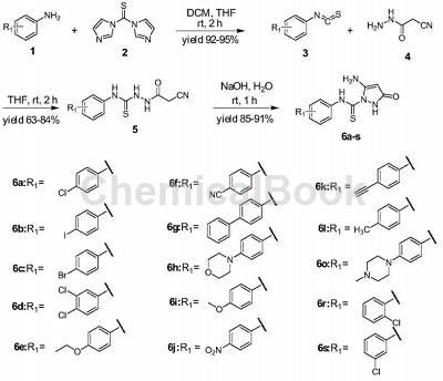 Wherein, Lower hydroxyalkyl group, lower alkoxy group, lower alkylamino group, lower haloalkoxy group, lower haloalkylamino group, lower cycloalkylamino group, lower alkynylamino group, amide group, lower cycloalkylamido group, lower amide group Alkyl, benzyl, substituted benzyl, nitro, ethynyl, morpholinyl, substituted piperazinyl or nitrile group; R2 is hydrogen, substituted or unsubstituted aromatic ring, aliphatic ring, or lower acyl group; R3 and R4 One is amino and the other is carbonyl oxygen. 4-Bromophenyl isothiocyanate can be used to prepare compound 6C, the route is as follows: