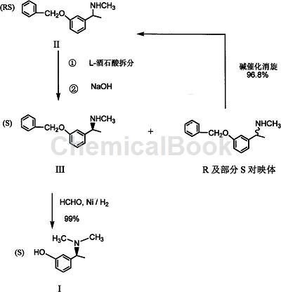 2) (S)-m-benzyloxy-α, N-dimethylbenzylamine (III) is added to the alcohol solution with formaldehyde solution or polyformaldehyde, catalyzed by Ray’s nickel, and hydrogenated at room temperature, normal pressure or low pressure. Aminomethylation and simultaneous removal of benzyl group yield (S)-3-(1-dimethylaminoethyl)phenol (I);