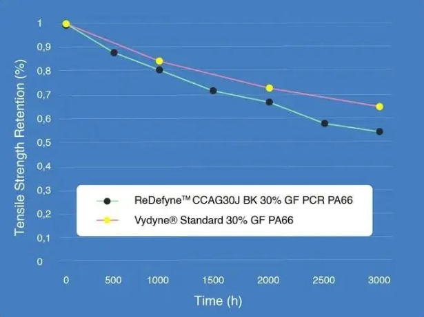 Take ReDefyne™ 30% glass fiber reinforced PA66 containing 25% recycled raw materials as an example. After testing, it has been verified that it has a comparable tensile strength retention rate to Vydyne® 30% glass fiber reinforced PA66.