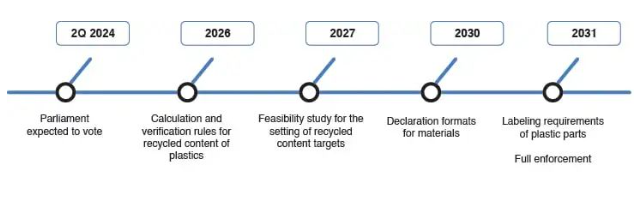 The EU Parliament plans to vote on the bill in the spring of 2024; publish the calculation and verification rules for recycled plastic content at the end of 2026; conduct a feasibility study on the recycled plastic content target in 2027; and implement material declarations in 2030. The bill is scheduled to be fully implemented in 2031.