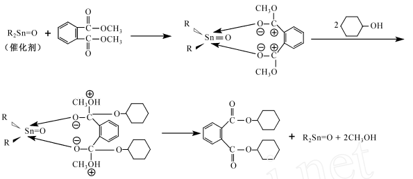 Add 32.6 mL (0.2 mol) of dimethyl phthalate, 46.8 mL (0.44 mol) of cyclohexanol and 1.4 g of organotin into a 250 mL three-necked flask, stir, and raise the temperature to 140 ℃ ~ 150 ℃, react at this temperature for 5 h, and methanol will continue to evaporate during the reaction process. Distill under reduced pressure to remove excess cyclohexanol and remaining methanol. Cool to obtain a crude product, which is then recrystallized with methanol to obtain a white solid powder, which is dicyclohexyl phthalate. The reaction route is shown in the figure below.