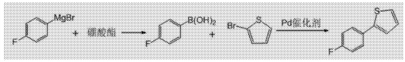 The object of the present invention is to provide a method for synthesizing 2-(4-fluorophenyl)thiophene, which has simple operation process, short production cycle, mild conditions, few side reactions, high yield, and high purity of the resulting product. In order to achieve the above purpose, CN201610223793.2 adopts the following technical solution: a method for synthesizing 2-(4-fluorophenyl)thiophene, including the following steps: 1) Preparation of 4-fluorophenylboronic acid: 4 as material 1 -The fluorophenyl magnesium bromide solution and the borate ester solution as material 2 are respectively pre-insulated to the reaction temperature and then the molar ratio of 4-fluorophenyl magnesium bromide and borate ester is 1:1.0 to 1:2.5. Mix, react at -10°C to 20°C, and then perform quenching and post-treatment to obtain 4-fluorophenylboronic acid; 2) Preparation of 2-(4-fluorophenyl)thiophene: 4-fluorophenylboronic acid Phenylboronic acid, 2-bromothiophene, and Pd catalyst are added to an organic solvent and dissolved to obtain material 3, in which: the molar concentration of 4-fluorophenylboronic acid in the organic solvent is 0.5 mol/L to 2 mol/L, and 4-fluorophenylboronic acid and The molar ratio of 2-bromothiophene is 1:1.0~1:1.5, and the molar ratio of 4-fluorophenylboronic acid and catalyst is 1:0.005~1:0.1; material 3 and the inorganic alkali aqueous solution as material 4 are pre-insulated respectively After reaching the reaction temperature, mix the 4-fluorophenylboronic acid and alkali in a molar ratio of 1:1.0 to 1:3.0, react at 50°C to 80°C, and then perform post-processing to obtain 2-(4- Fluorophenyl)thiophene.