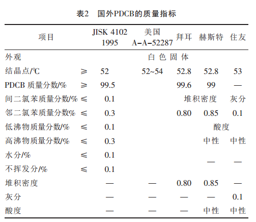 P-Dichlorobenzene, also known as 1,4-dichlorobenzene (hereinafter referred to as “PDCB”), is a white crystal with a molecular weight of 147.00, a melting point of 53.1°C, a boiling point of 174°C, a relative density of 1.2475 (20/4°C), and a refractive index. 1.5285, flash point 65℃, easily soluble in ethanol, soluble in ether and benzene, insoluble in water, sublimates at room temperature, and has a pungent camphor smell. Purified p-dichlorobenzene (purity above 99%) can be used as a moth-proofing agent, antifungal agent, dye, and medicine; it can also be used as a solvent; it can replace the potential carcinogen naphthalene for moth-proofing, and the effect is better. Industrially, it is mainly recovered from by-products of chlorobenzene production, and higher yields can be obtained through directional chlorination of benzene. At present, there are no unified national standards and industry standards for PDCB. Domestic enterprise standards are mostly formulated with reference to the corresponding standards of Western developed countries, but some indicators are not restricted. The quality indicators of PDCB at home and abroad are shown in Table 1 and Table 2.
