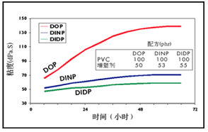 Under the same effect conditions, the viscosity of plastisol made from DIDP is lower than that of plastisol made from DOP. In addition, the change in viscosity over time is relatively low, that is, the viscosity of the plastisol decreases initially and remains low. Therefore, viscosity inhibitors do not have to be used, reducing costs.