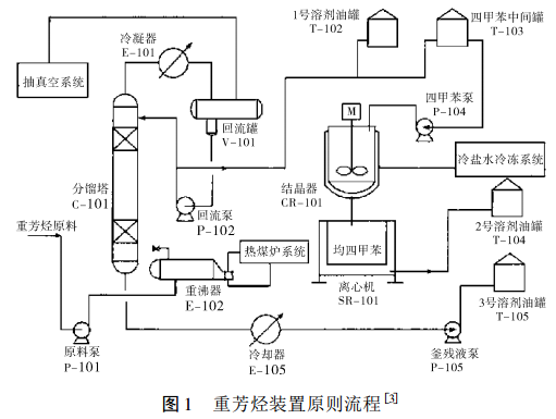 The output of paraxylene (PX), the raw material for the production of polyester, has increased significantly in recent years, and the PX unit has heavy aromatic by-products. In general designs, heavy aromatics are sent directly to gasoline and diesel storage tanks for blending. However, due to the low hydrogen-to-carbon ratio and wide distillation range of heavy aromatics, they affect the dry point of gasoline, reduce the cetane number of diesel and contain condensed rings in the fuel exhaust. Due to aromatic hydrocarbons and other reasons, it is not suitable for internal combustion engine fuel. A domestic refinery unit makes full use of the heavy aromatic hydrocarbons produced by the PX unit. Through distillation, freeze crystallization, centrifugal separation and other processes, it can separate the heavy aromatic hydrocarbons that are not easily utilized into 1# solvent oil, 2# solvent oil, 3# solvent oil and so on. #The three types of solvent oils produced by products such as solvent oil and high value-added pylene tetramethylbenzene are all products in short supply in the market, and their added value is higher than the value of raw materials. Methyl tetramethylbenzene is a high value-added fine chemical raw material. The heavy aromatics raw material used in the unit is a by-product of the aromatics complex unit of the refinery, and its composition is shown in Table 1. The physical and chemical indicators of the produced products are shown in Table 2.