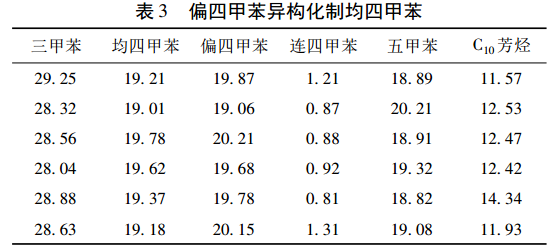Methylene (1,2,3,5-tetramethylbenzene) is produced by liquid phase isomerization under normal pressure and lower reaction temperature. Li Huimin et al. developed a two-component solid acid catalyst. In order to suppress the disproportionation reaction, a certain amount of trimethylbenzene was added to the reaction system to fully proceed with the main reaction and obtain higher yield of mesitylene. The experimental results are shown in Table 3.