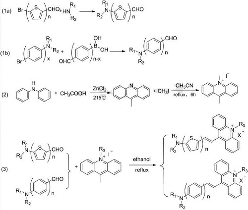 (3) n-bithiophene with a dialkylamino group and formaldehyde as substituents at the terminal 5 positions respectively or n-biphenyl with a dialkylamino group and formaldehyde as a substituent at the terminal 4 positions and 9,10- The dimethyl acridine salt reacts to generate the n-bithiophene or n-biphenyl acridine salt.