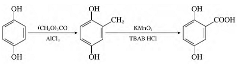 Using hydroquinone as raw material, the target product 2,5-dihydroxybenzoic acid was synthesized through two-step reactions of methylation and oxidation. The optimal conditions for the methylation reaction are: the amount of catalyst ALCL3 is 130% of the amount of substrate, the reaction temperature is 130°C, and the reaction time is 4 hours. The optimal conditions for the oxidation reaction are: the dosage of catalyst TBAT is 5% of the substrate dosage, the reaction temperature is 100°C, and the reaction time is 4 hours. Under optimal conditions, the yield of 2,5-dihydroxybenzoic acid can reach 90.3%.