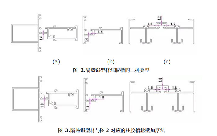 There are three types of glue injection grooves for insulating aluminum profiles. As shown in Figure 2, the improvement method of thickening the wall thickness of the overhanging wall of different types of glue injection grooves is shown in Figure “>3shown. This is an effective method to solve the deformation of glue-injected heat-insulating aluminum profiles. Especially for glue-injected aluminum profiles with thin wall thickness, it is necessary to ensure the stability of extruded materials.