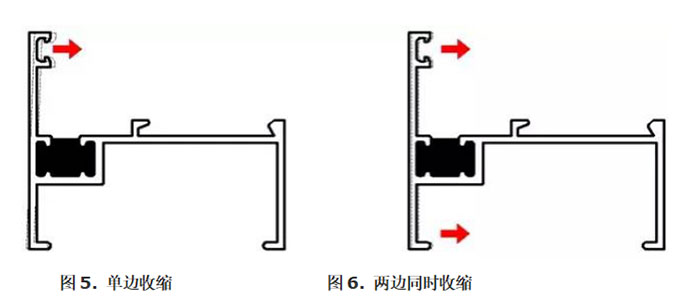 When opening the teeth of the heat-insulating glue-injected aluminum profile, pay attention to adjusting the teeth. Deep, it is advisable to control the tooth depth at around 0.3~0.5mm, and avoid excessively deep tooth openings and excessive pressure,Prevent the profile from beingPressure deformation causes the opening to become larger. The optimal ambient temperature for glue injection is 20~30, relative humidity<85%. After the profile is injected with glue, it is required to be placed neatly and without longitudinal bends. The pads between the layers must be vertical up and down. The parking time for glue injection is 10about minutes, the specific parking time is based on the colloid hardness reaching 60 or above as the standard Start cutting the bridge, but you should avoid parking it for too long, which will lead to large and uneven colloid shrinkage, resulting in excessive closing of the profile, and prevent severe shrinkage of one side before the bridge is cut, as shown in the figure 5shown. Control the time for bridge cutting. The amount of shrinkage before bridge cutting is just close to the pre-deformation amount before glue injection. After bridge cutting, the shrinkage of the colloid will be carried out on both sides at the same time, thus stabilizing the shape of the heat-insulating glue-injected profile, as shown in the figure6shown.