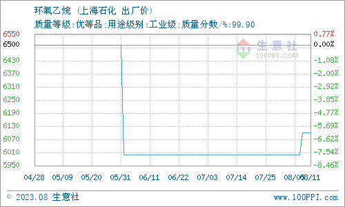 On July 29, the price of ethylene oxide in East China remained the same, and the external implementation was 6,550 yuan/ton. Compared with the same period last month, the chain fell by 13.25%, and fell by 9.03% year-on-year.