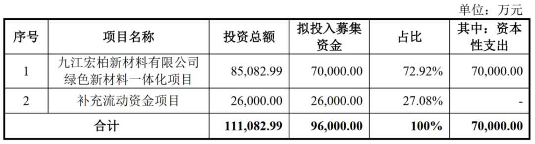 The total investment in the green new material integration project of Jiujiang Hongbai New Materials Co., Ltd. is 850.8299 million yuan. It plans to use 700.000 million yuan of funds raised from this issuance of convertible corporate bonds to unspecified objects, and the remaining part will be used by the company with its own funds. Or solve it by self-financing.