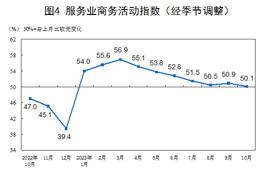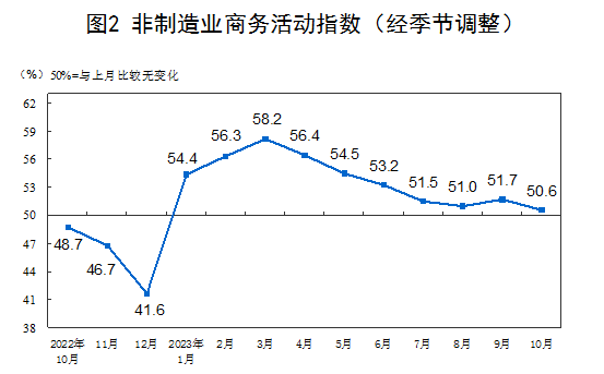 In October, the non-manufacturing business activity index was 50.6%, down 1.1 percentage points from the previous month and still higher than the critical point. The non-manufacturing industry generally maintained expansion.