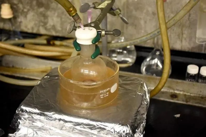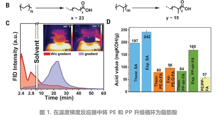 Fill the flask with wax produced from waste polyethylene and polypropylene, heat it in an oil bath, oxidize the wax under the action of airflow, and produce fatty acid through catalytic oxidation.