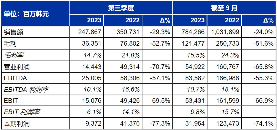 The gross profit margin was 14.7% (Q3 2022: 21.9%). Compared with the third quarter of 2022 (41.376 billion won), net profit dropped to 9.372 billion won.