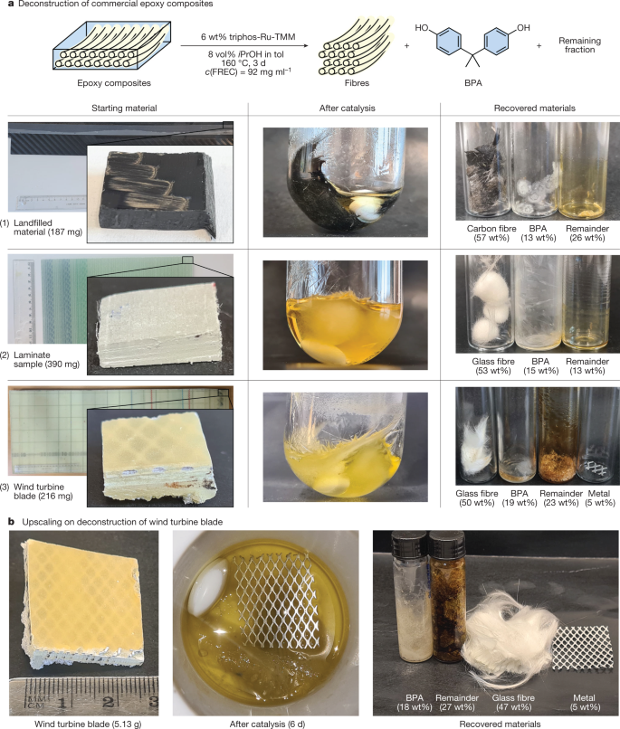 Specifically, the researchers showed that by using a ruthenium-based catalyst and the solvents isopropanol and toluene, they could separate the epoxy matrix and release one of the original building blocks of epoxy polymers, bisphenol A, and intact glass fibers in a single the process of.