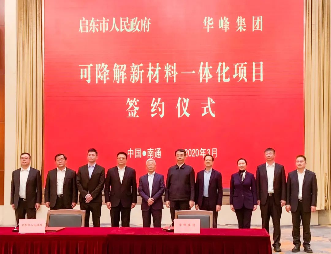 It is reported that on the afternoon of March 18, 2020, the signing ceremony of the Huafeng Biodegradable New Materials Integration Project with a total investment of 10 billion yuan was held in Nantong City, Jiangsu Province. Witnessed by Nantong Mayor Wang Hui, Qidong Municipal Party Committee Secretary Wang Xiaobin, Huafon Group Chairman You Xiaoping, Chairman You Feiyu and other government and enterprise leaders, Huafon Group Co., Ltd. and Qidong Municipal Government signed a cooperation agreement.