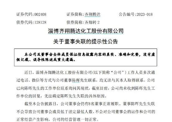On April 12, Qixiang Tengda issued an announcement saying that recently, the staff had contacted Chen Hui, the director of the company, by telephone, WeChat, etc. many times, but they were unable to get in touch with him. The company has contacted Chen Hui’s work unit to inquire about his current situation. As of now, the company has not received a reply from Chen Hui’s work unit, and cannot determine the specific reason why Chen Hui lost contact.