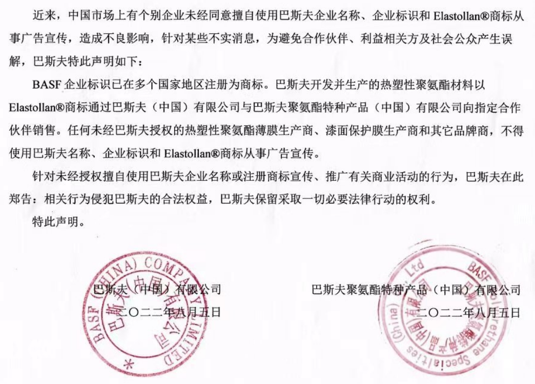Earlier, BASF, a well-known German chemical company, issued a statement on its official account: BASF corporate logos and trademarks are not allowed to be used for publicity without permission. The wording of the statement was harsh, warning merchants who falsely used the BASF brand for illegal publicity.