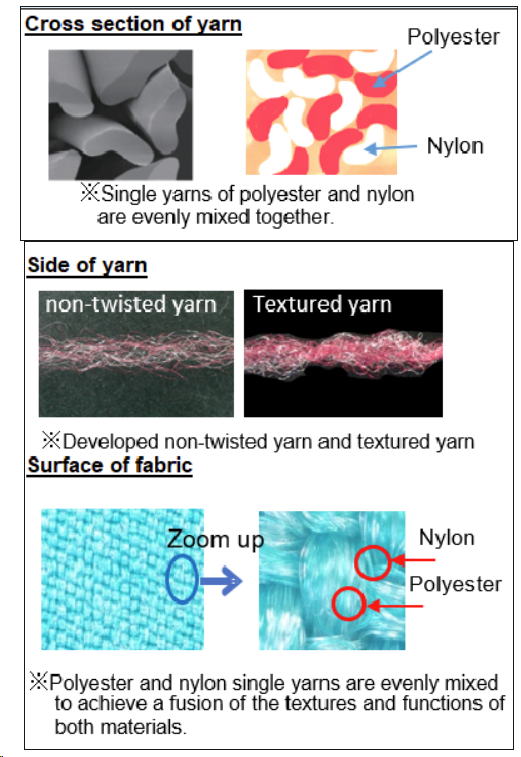 The product uses polyester and nylon evenly blended high-deformation cross-section multi-ply yarn, which is made through special spinning technology and a woven or knitted structure. Due to the different dyeing effects of the two materials, Microft™