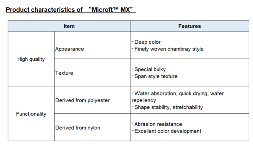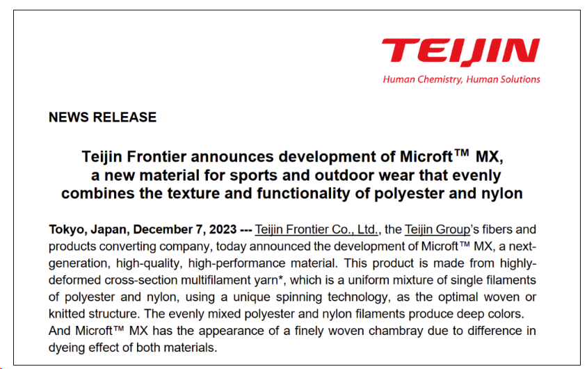 On December 7, Teijin Pioneer Co., Ltd., a fiber subsidiary of Japan’s Teijin Group, released Microft™ MX high-performance fabric.