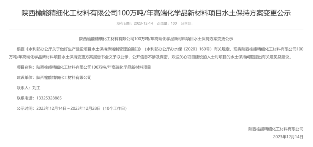 On December 14, the official website of Shaanxi Yulin Energy Group Co., Ltd. announced that the full text of the soil and water conservation change plan report of Shaanxi Yuneng Fine Chemical Materials Co., Ltd.’s 1 million tons/year high-end chemicals new materials project was Disclosure and disclosure of information does not involve confidentiality. People who care about the project construction are welcome to provide relevant opinions and suggestions on the water and soil conservation issues of the project.