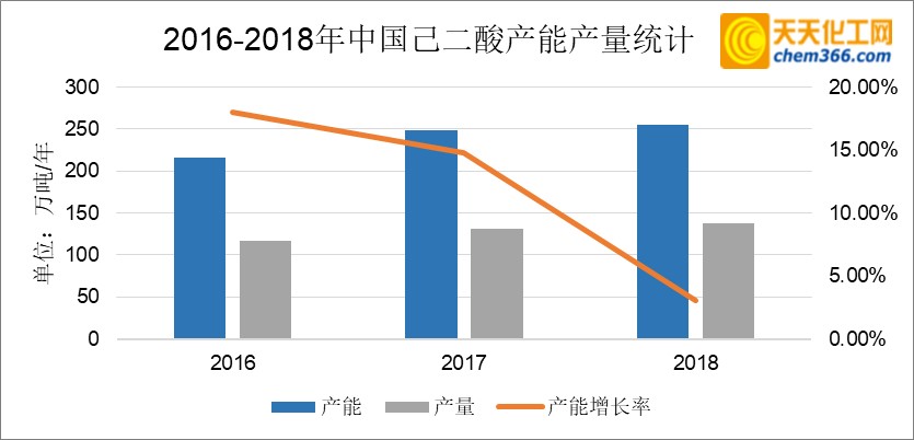 In recent years, the growth rate of my country’s adipic acid production capacity is greater than that of downstream demand. Domestic suppliers are facing fierce market competition due to overcapacity. In 2016, Henan Shenma , Shandong Hongda’s new production capacity is still being released, and domestic production capacity is constantly rising, with a total domestic production capacity of 2.16 million tons per year. In 2017, the new production capacity of Shanxi Taiyuan Chemical and Chongqing Huafon continued to be released, and the risk of overcapacity continued to accumulate. With the new production capacity of Huafon adipic acid put into operation at the end of 2017, the total domestic production capacity in 2017 reached 2.48 million tons per year. In 2018, Shenma’s 75,000-ton/year adipic acid plant was put into operation, and China’s total adipic acid production capacity reached 2.555 million tons in 2018. China has become an important AA production base in the world.