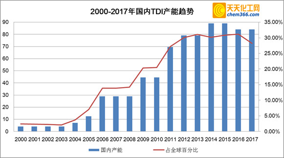 In 2004, domestic production capacity of TDI began to increase significantly. It can be seen from the change trend of TDI production capacity in the above figure from 2000 to 2017 that China’s production capacity made a qualitative leap in 2006, 2009 and 2011 respectively. Mainly due to BASF (160,000 tons TDI plant in 2006), Covestro (250,000 tons TDI device) the opening of two sets of world-scale equipment, plus the commissioning of three domestically produced 50,000-ton devices.