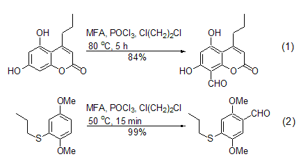 The Vilsmeier-Haak reaction conditions using MFA are very mild. 1,2-dichloroethane is the most commonly used reaction solvent, and sometimes the reaction can be carried out under solvent-free conditions. The reaction can be carried out at room temperature or at the reflux temperature of the reaction solvent, and the yield is generally moderate to high. For example: in the presence of POCl3, MFA can react with activated aromatic compounds to introduce formyl groups on the aromatic ring. The benzene ring substituted by amino, hydroxyl or alkoxy groups can be conveniently generated by the Vilsmeier-Haak reaction of this reagent to generate the corresponding benzaldehyde derivatives (Formula 1, Formula 2)[2~5].