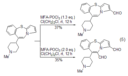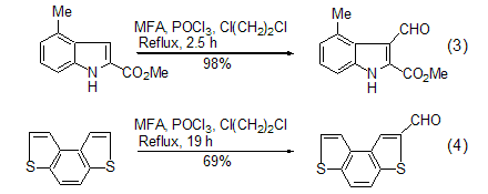 Vilsmeier-Haak using MFA The selectivity of the reaction mainly comes from two aspects. When the reaction substrate contains multiple aromatic rings, using a limited amount of MFA can make the formylation reaction preferentially proceed on the most reactive ring (Formula 5)[11]. When the reaction substrate contains multiple identical reaction sites, using an excess of MFA can cause formylation reactions to occur simultaneously at these sites to generate polyformyl compounds [12].