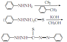 1. Prepare according to the following steps. 1. Preparation of phenylhydrazine dithiocarbamate salt. Dissolve 13g phenylhydrazine in 60ml ether, and add 5.2ml carbon disulfide dropwise. The resulting white precipitate was filtered off and washed with diethyl ether to obtain about 15 g. 2. Preparation of diphenylthiosemicarbazide. Place the above product in a beaker and heat it on a water bath at 96-98°C. After the material melts, it releases hydrogen sulfide and turns into a light yellow gel. If ammonia gas is released, remove the heat bath and cool with water. Cool again with ice. Then cool it with ice, add 15 ml of water and absolute ethanol, take it out from the ice bath, and heat it slightly while stirring. At this time, the gelatin becomes a crystalline product, filter it with suction, and wash it with ethanol to obtain about 7.5g. 3. Preparation of dithizone. Add the above-obtained diphenylthiosemicarbazide to the caustic potassium solution (6g potassium hydroxide dissolved in 60ml anhydrous methanol), reflux on a boiling water bath for 5 minutes, take it out and cool it in an ice bath. Filter, and the filtrate is acidified with sulfuric acid until the Congo red test paper changes color and a dark blue precipitate precipitates. After suction filtration, the precipitate is treated with caustic potassium solution and sulfuric acid again. After suction filtration, it is washed with water until no sulfate radicals exist. After drying at 40℃, about 3g of dithizone is obtained.