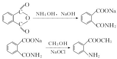 The preparation method is to obtain phthalic anhydride through amination degradation, diazotization, substitution, oxidation, acid precipitation and other steps. 1. Amination, degradation and esterification to prepare methyl anthranilate. Add phthalic anhydride to the reaction pot, add 0°C ammonium hydroxide solution, raise the temperature to 50°C, and add For sodium hydroxide solution, control the alkali addition rate to keep the temperature below 70°C and the pH value at 8.5 to 8.9. After adding alkali, adjust the pH value to 12~13, keep it at 65~70°C for 0.5h, keep it warm for 35h to drive out ammonia gas, cool to -10°C, add pre-cooled -10°C methanol and -10°C sodium hypochlorite The solution should be reacted below 0℃ for 45 minutes, and then gradually raised to 30℃. It should show a colorless reaction when tested with potassium iodide starch test paper, and then add an appropriate amount of sodium bisulfite for hydrolysis. After the material liquid becomes dilute, heat it to 50°C, then add 80°C hot water, stir and dissolve, let it stand, filter, and separate the oil layer to obtain methyl anthranilate.
